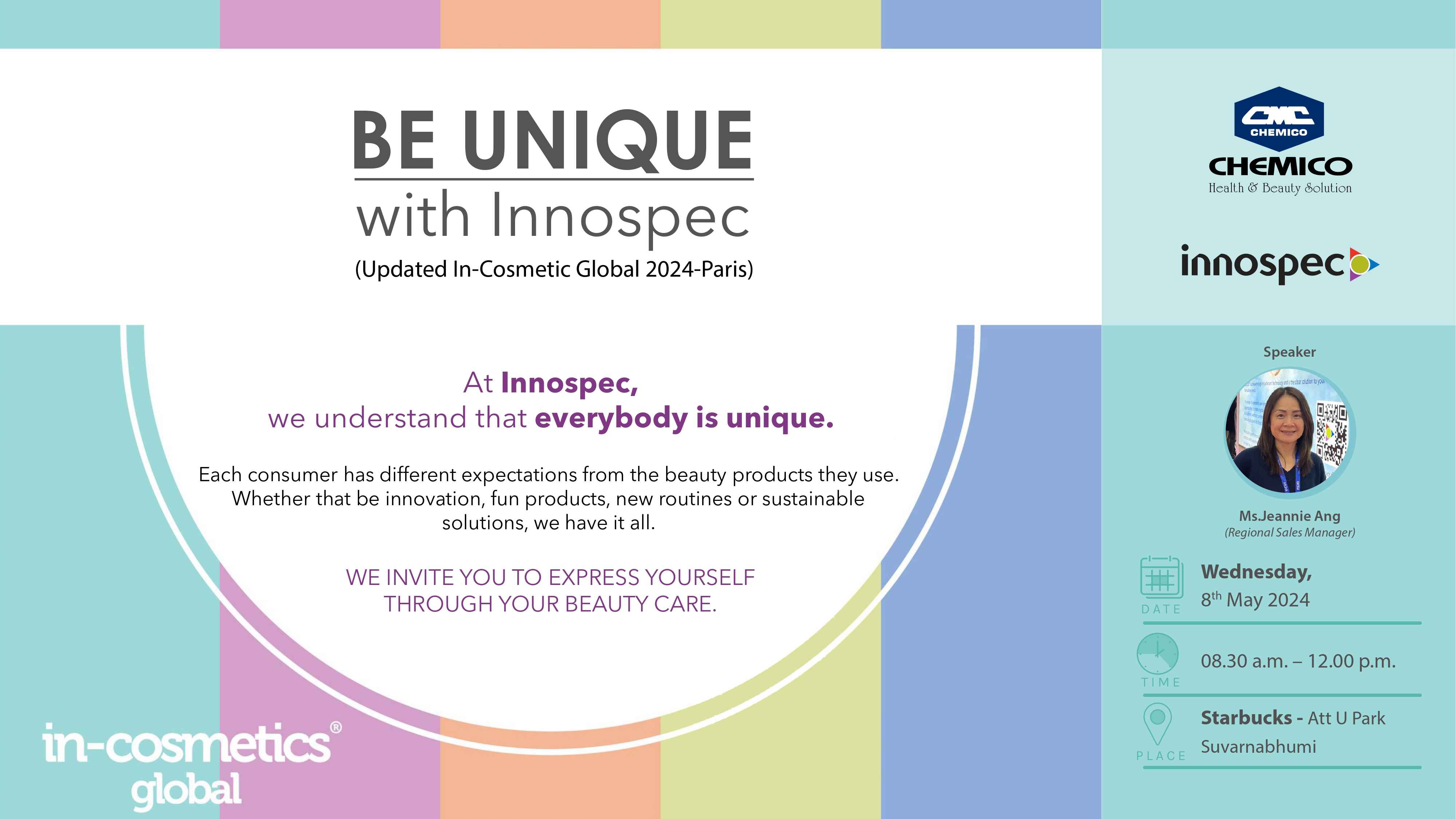 under the title “Be Unique with Innospec”. This seminar updated global trends and Innospec’s latest formulation collection of the five generations presented in in-cosmetics Global 2024, Paris.....