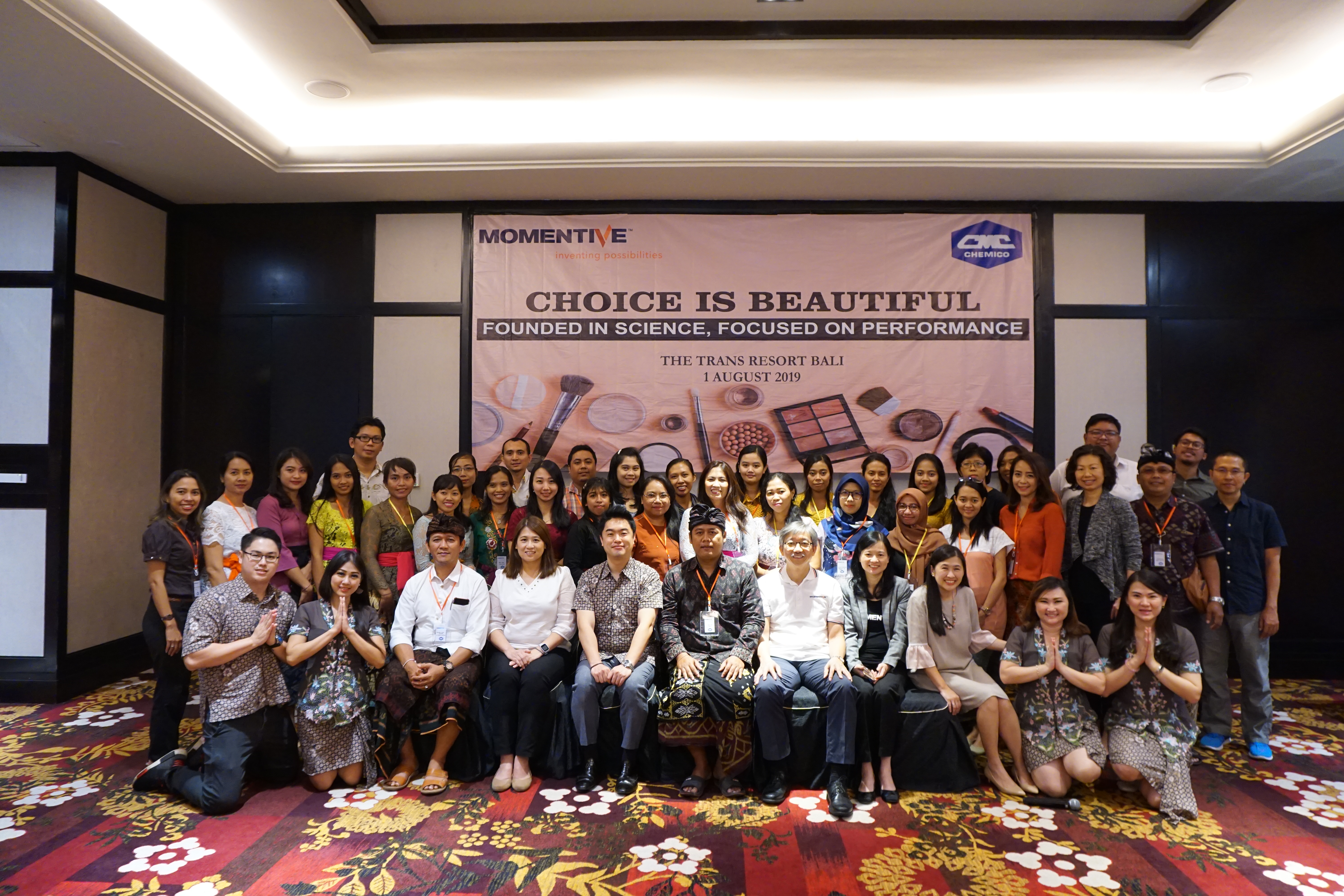 Momentive Performance Materials Inc. and PT. Chemico Surabaya held 2 seminars as follows: 1. on July 31, 2019 at Sheraton Surabaya Hotel, Surabaya, East Java 2. on August 1, 2019 at The Trans Resort Seminyak, Bali. These seminars are under the same topic "Choice is Beautiful, Founded in Science, Focused on Performance”. This year, we have organized seminars with Momentive for 4 times totally. The first 2 times were held at Semarang and Yogyakarta in Central Java. The seminar presented information about Momentive new products and innovations for skin care, make-up and hair care. New products such as Velvesil E-Gel PMF Emulsion, Silsoft E-Pearl PMF Emulsion, Velvesil Magic B Gel and Silsoft EAU Microgel were introduced. Knowledge about basic silicone, INCI name, Silsoft 034 and Boron Nitride were also included. And, for hair care products, Silsoft CLXE and Silsoft AX/AXE were introduced. Demonstrations on how to use Velvesil E-Gel PMF Emulsion, Silsoft E-Pearl PMF Emulsion and Silsoft EAU Microgel were included in the workshop section.