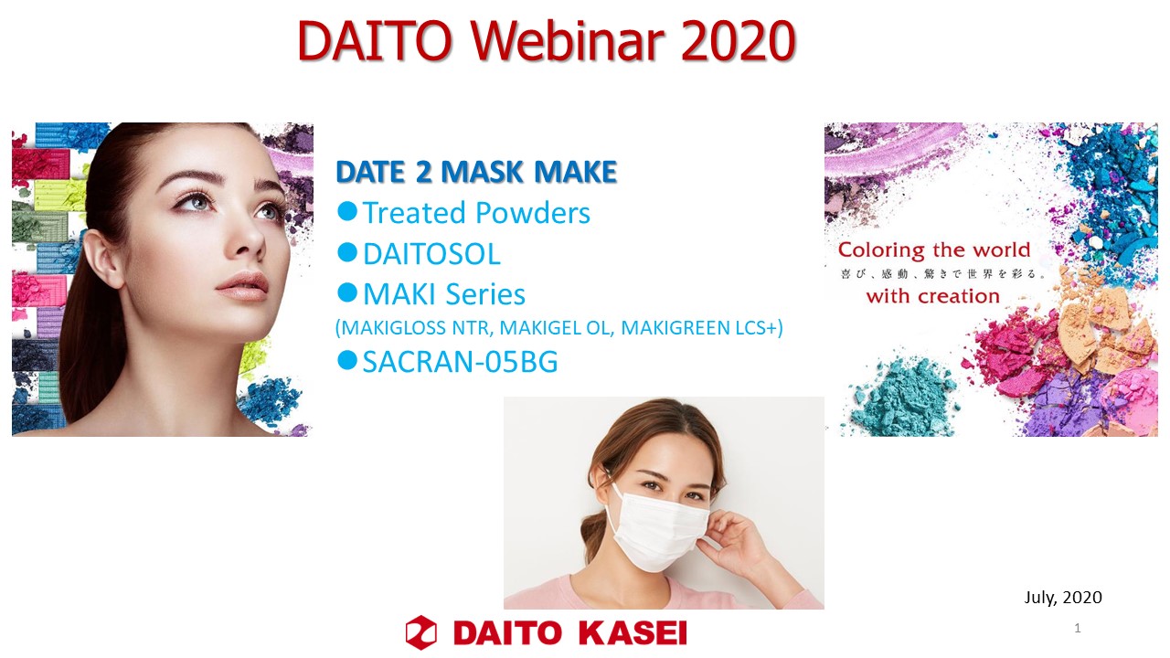 Daito Kasei Kogyo Co.,Ltd., Japan in collaboration with Chemico Inter Corporation Co., Ltd. held the second Daito’s webinar entitled “Mask Make” on July 21, 2020. The seminar started with the change in cosmetic trends and the situation of cosmetic sales in Japan due to COVID-19 pandemic. And under this condition, the so called “Mask Make” concepts were created. Daito has also demonstrated some commercial products and the guide formulations containing their ingredients related to “Mask Make” concepts.