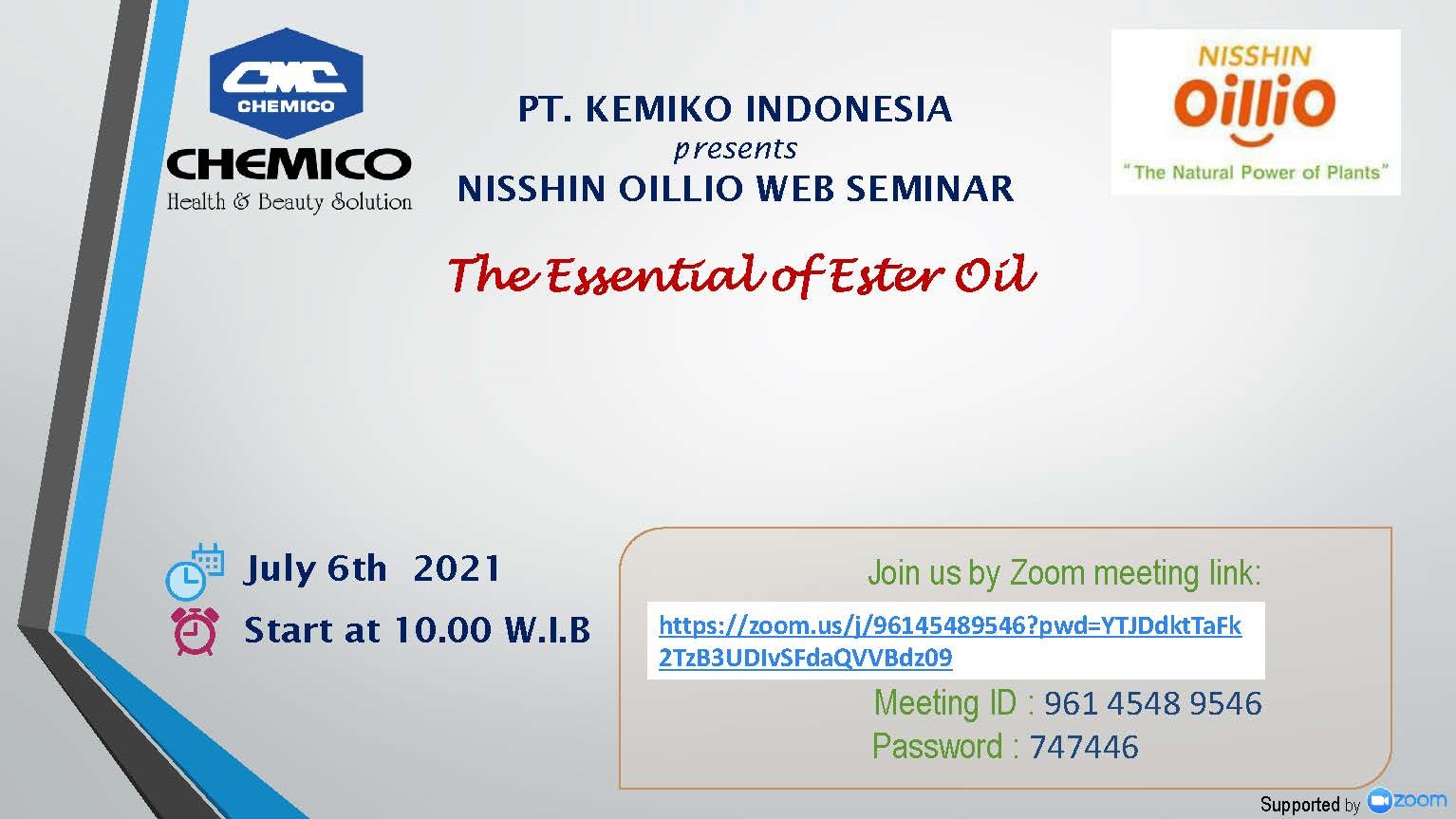 The Nisshin OilliO Group, Ltd. and the expertise from Britoncosmetech collaborated with  PT. Kemiko Indonesia, Jakarta held a webinar on July 6, 2021. The topic was “The Essential of Ester Oil”.