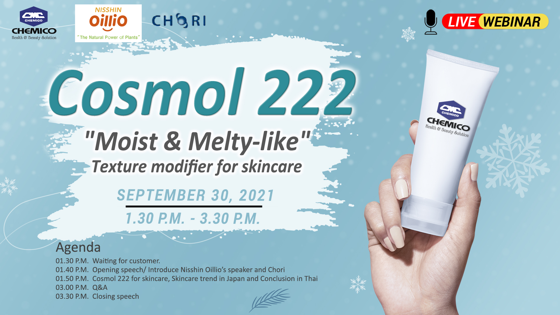 Chemico Inter Corporation Co., Ltd. in collaboration with The Nisshin Oillio Group, Ltd. and Chori Co., Ltd. held a webinar for Thai customers entitled “Cosmol 222 Moist & Melty-like Texture Modifier for Skincare”