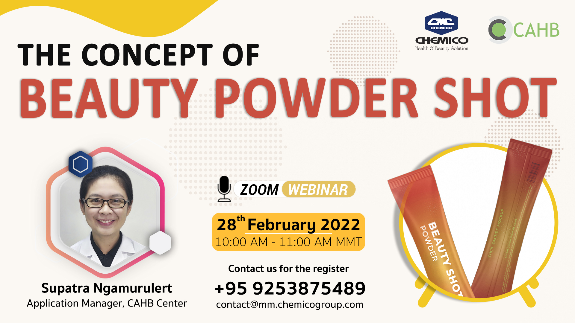 Chemico Myanmar Co., Ltd. together with Chemico Asia Health and Beauty (CAHB) Center, Thailand held a webinar entitled “The Concept of Beauty Powder Shot ” on February 28, 2022. This webinar focused on new trends of beauty powder shot products and the related product formulations. Raw material information that used in beauty powder shot formulations was also included.