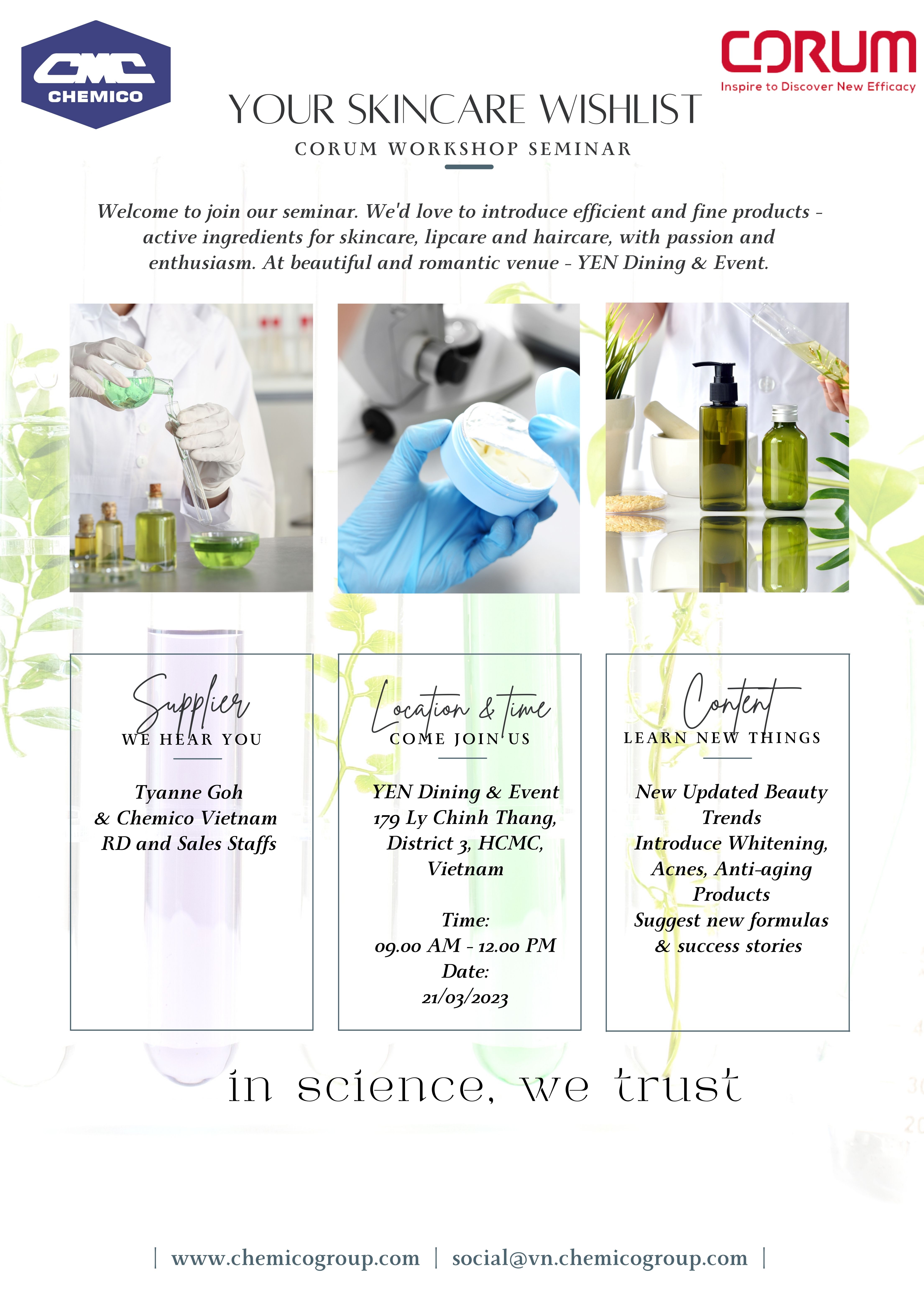 Chemico Vietnam Co., Ltd. in collaboration with a famous skincare ingredient supplier from Taiwan – Corum held the fabulous workshop entitled “Your Skincare Wishlist” on March 21, 2023. It was a very worthy chance to update the latest beauty trends as well as the efficacy of skincare actives from Corum. The main contents also included the clinical tests of specific ingredients for whitening, acne treatment, anti-aging, anti-dandruff, anti-wrinkle, etc. All of these ingredients are currently used by many famous cosmetics brands over the world.