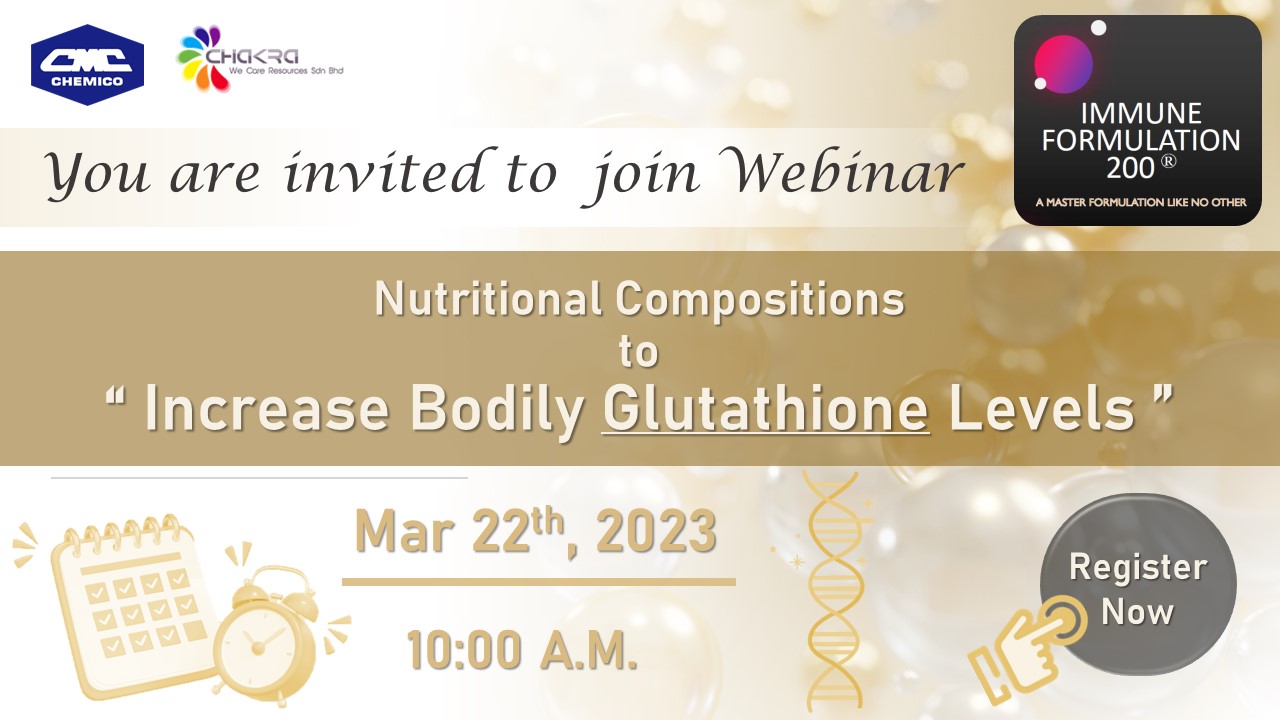 Chakra We Care Resources Sdn. Bhd., Malaysia in collaboration with Chemico Inter Corporation Co., Ltd., Thailand organized a webinar entitled “Nutritional Compositions to Increase Bodily Glutathione Levels” on March 22, 2023. The webinar provided Glutathione information, Immune formulation 200®, Clinical studies as well as Solubility test and Applications. The information is very useful in the development of new products in the field of dietary supplements (hard capsule, tablet, powder shot) and powder drink.