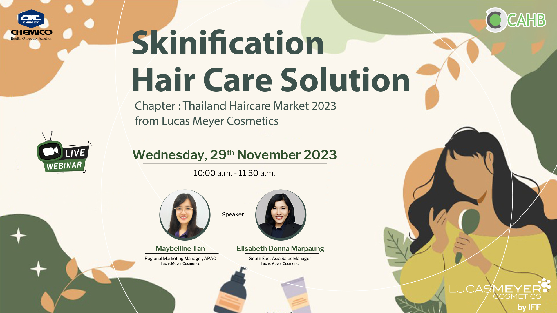 Lucas Meyer Cosmetics Inc. in collaboration with Chemico Inter Corporation Co., Ltd. held an online seminar on November 29th, 2023 with the title “Skinification Hair Care Solution, Chapter: Thailand Haircare Market 2023”. The webinar introduced effective ingredients for specific targeted solutions which supported hair care claims in Thai market such as repaired hair, environmental protection, healthy scalp and fuller hair.