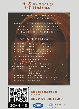 Sophim, France and Chemico Asia Pacific (Malaysia) Sdn. Bhd., organised a seminar on December 7th, 2023 at Chemico Asia Pacific (Malaysia) seminar room. The presentation included information about Phytosqualan and the new ingredient - Phytolive Fine (a natural alternative to plastic scrub beads) to upgrade the cosmetic products and shared about the uniqueness of scrub to improve excellent cleansing on the skin. The current market trends and success products of using Sophim ingredients were presented to the customers as well.