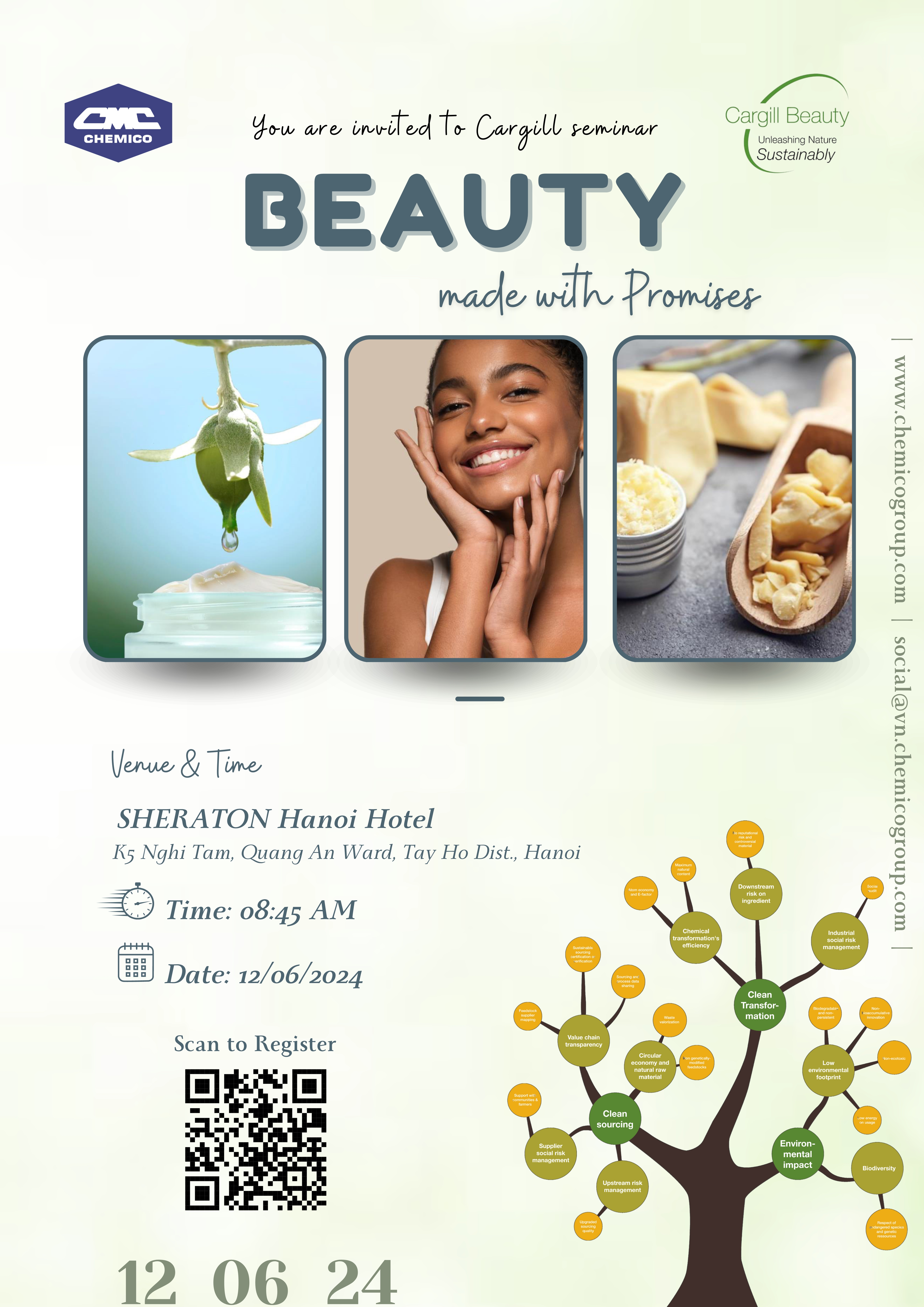 Cargill Beauty in collaboration with Chemico Vietnam Co., Ltd., Hanoi held a big seminar at Sheraton Hanoi Hotel on June 12th, 2024 to introduce the most effective beauty solutions from nature. The topic was “Beauty made with Promises”. Each product presented in the seminar has a unique property that hopefully would help create the signature breakthrough for your products. Actigum series, “Emollient mapping”, Starch series, Floraesters K-20W Jojoba, as well as new technologis like FiberDesign Citrus, CococaDesign were included in the content. Moreover, we also welcomed all customers to visit the showcase area where all latest trendy beauty products developed by Chemico application team were displayed.