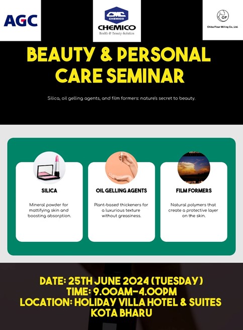 AGC Si-Tech Co., Ltd., Japan and Chiba Flour Milling Co., Ltd., Japan in collaboration with Chemico Asia Pacific (M) Sdn. Bhd., Malaysia held a seminar entitled “Beauty and Personal Care Seminar” on June 25th, 2024 in Kota Bharu, Kelantan. The main topics of the seminar were Silica, Oil Gelling Agents and Film Formers. The suppliers presented successful market products, and the customers had the opportunity to evaluate them. Sample kits were provided to customers along with explanations of formulations by Chemico Malaysia application team. The session concluded with quizzes and prizes awarded.