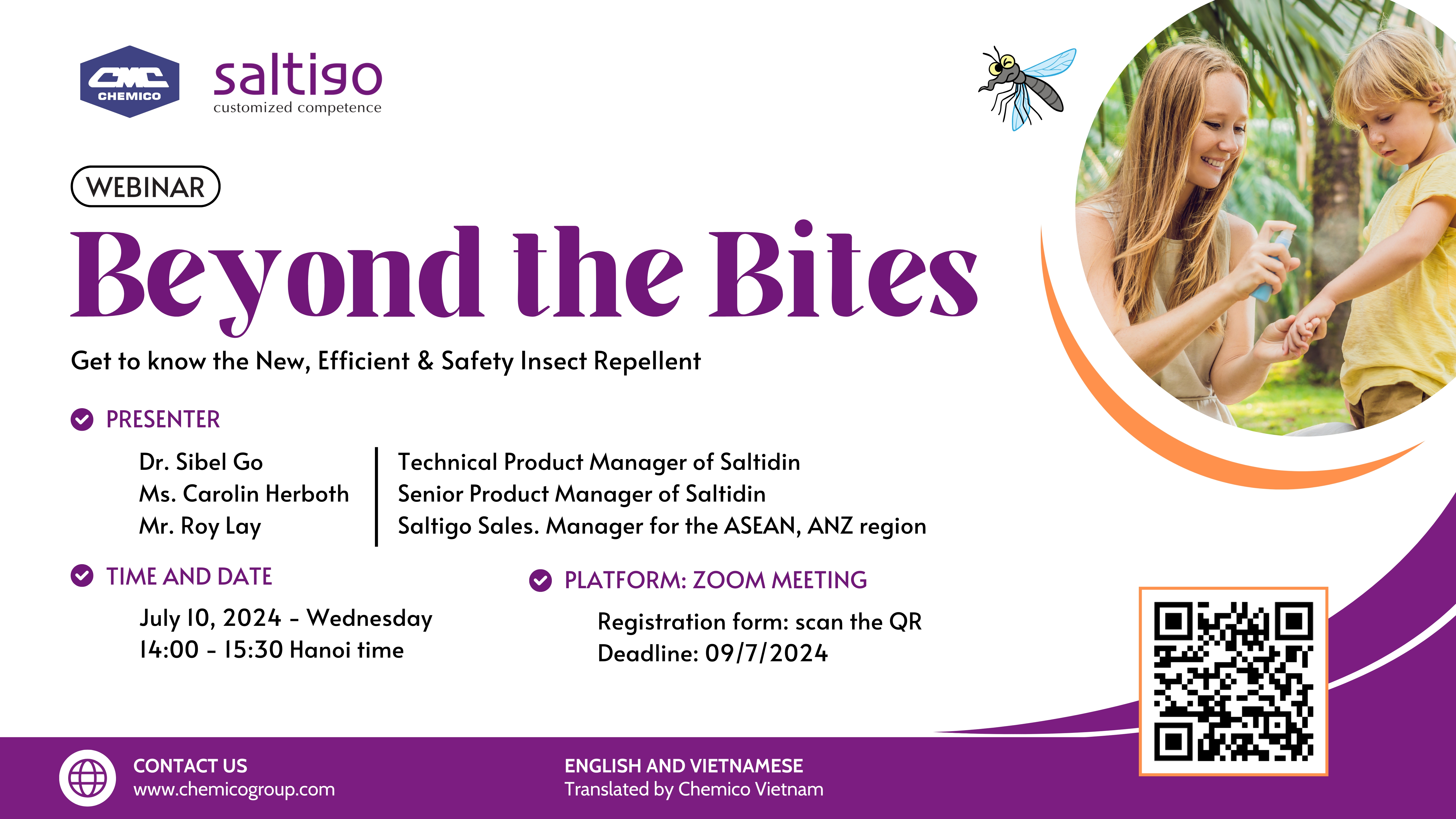 Saltigo GmbH. in collaboration with Chemico Vietnam Co., Ltd. held a webinar under the topic “Beyond the Bites” on July 10th, 2024. The main content of webinar was about the effective insect and mosquito repellent ingredient for 6-month-old children and pregnant women (Saltidin). The presentations also included the latest Dengue and Malaria epidemics over the world and in Vietnam in 2024, the difference between Saltidin and mosquito repellents (DEET and IR3535). The successful products with Saltidin and formulations in various formats (spray, gel, lotion and solid bar) developed by Chemico Vietnam Application team were presented as well.
