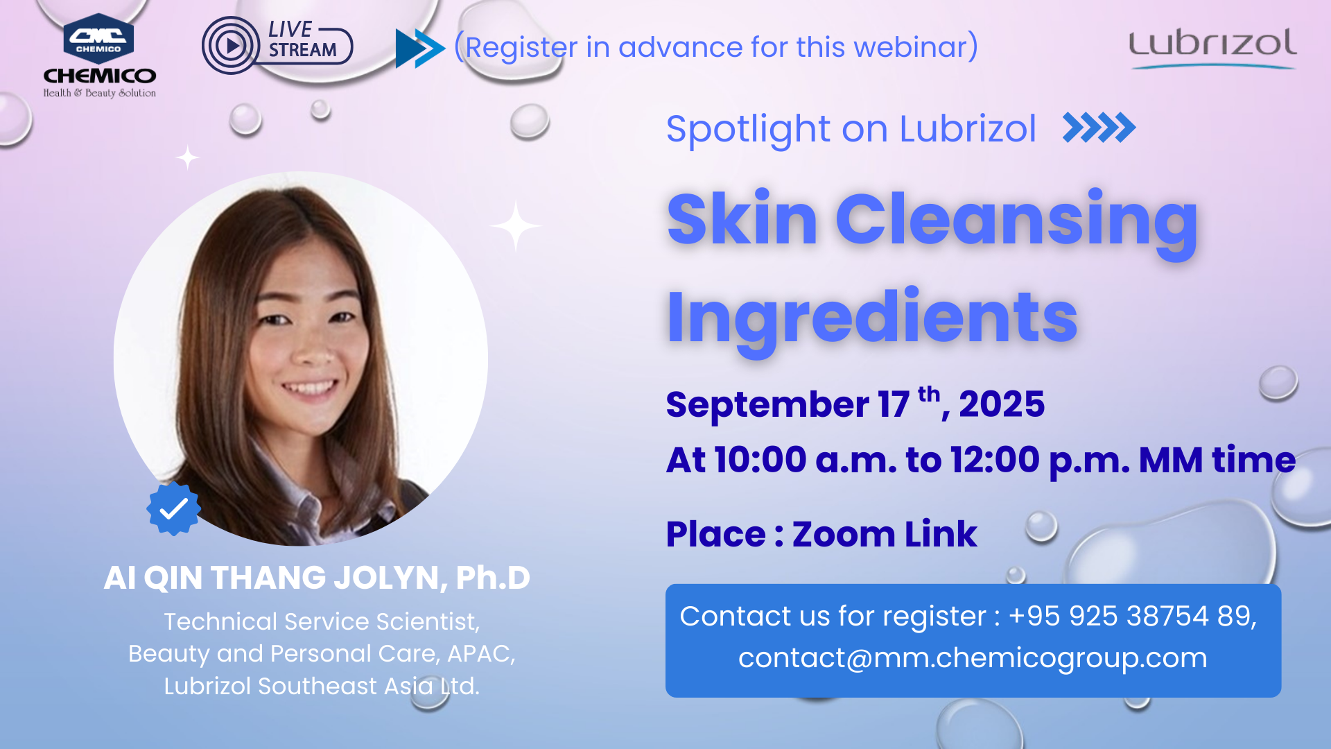 Lubrizol Corporation in collaboration with Chemico Myanmar Co., Ltd. organized a webinar on September 17th, 2025 under the topic " Spotlight on Lubrizol Skin Cleansing Ingredients”. This webinar shared about detailed information of thickeners and conditioning agents. The interesting formulations with Lubrizol products were included as well.