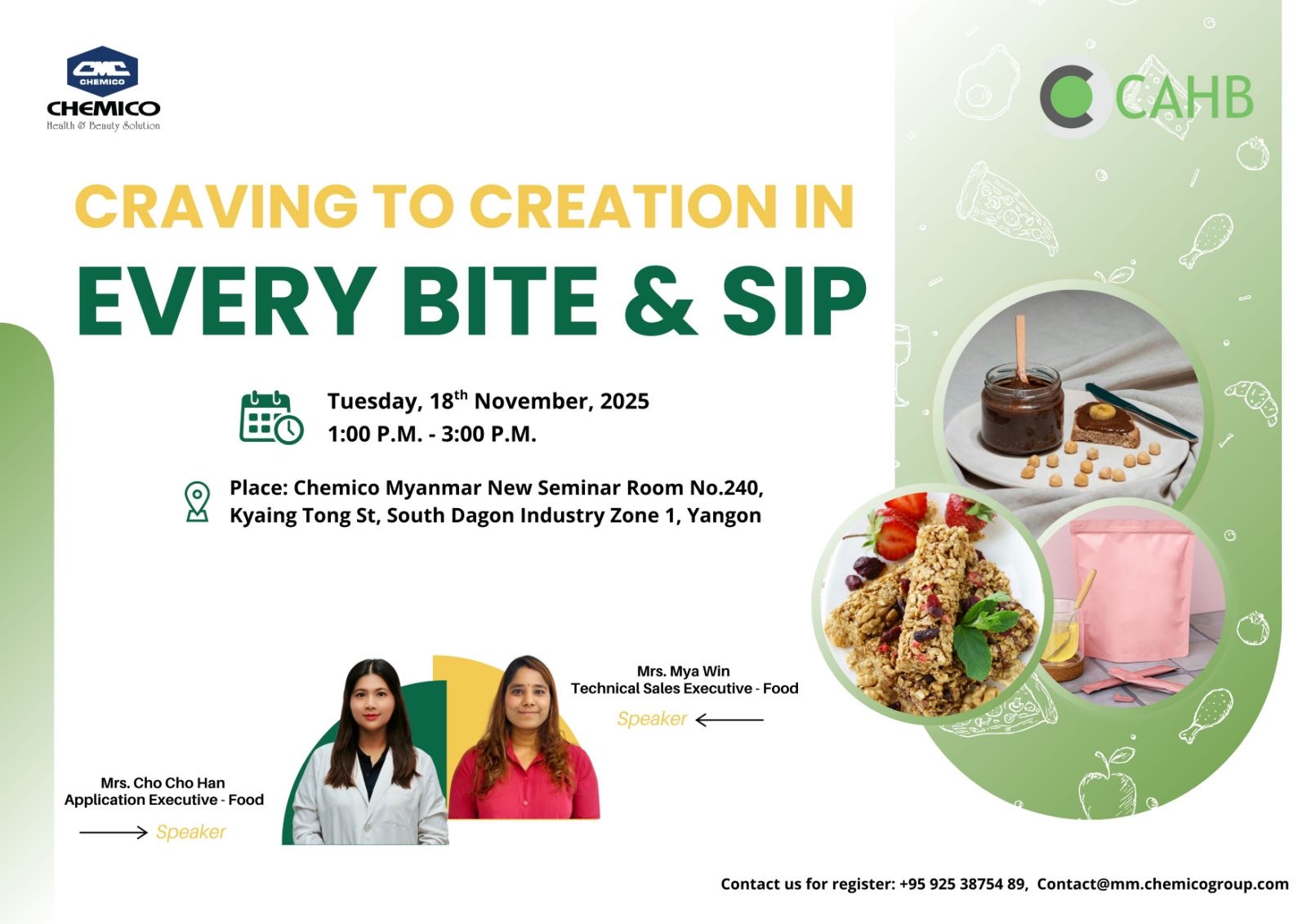 Chemico Myanmar Co., Ltd. successfully held a mini-seminar entitled " CRAVING TO CREATION IN EVERY BITE & SIP " on November 18th, 2025 at  Chemico Myanmar Seminar Room. The seminar focused on transforming consumer cravings into innovative food and beverage products, covering market trends and practical formulation techniques. Participants had the valuable opportunity to engage directly with the speakers, explore prototype samples, and discuss on how new, functional ingredients can be leveraged to create the next generation of market-leading food and beverage offerings. The session was highly interactive, fostering a vibrant exchange of ideas and potential collaborations.